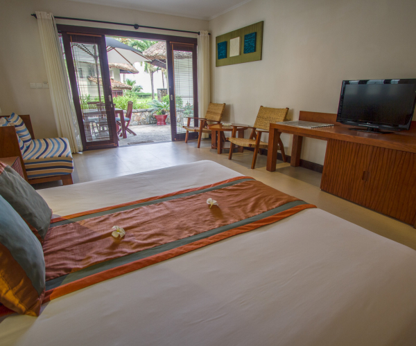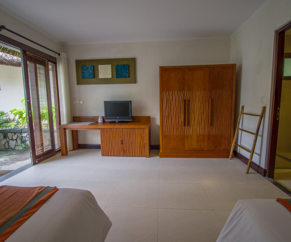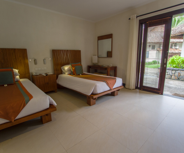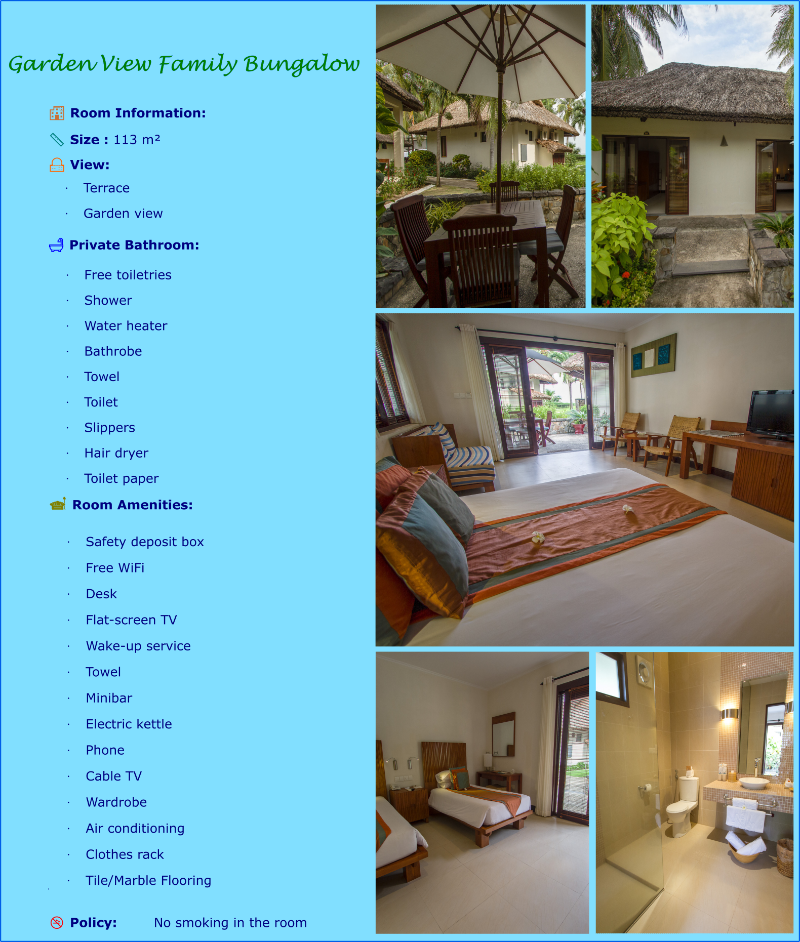 - The Garden View Family Bungalow offers two guestrooms (one room with queen-size bed, one room with twin beds) and separate bathrooms with a bathtub in the master queen bedded room (not inter-connecting)
