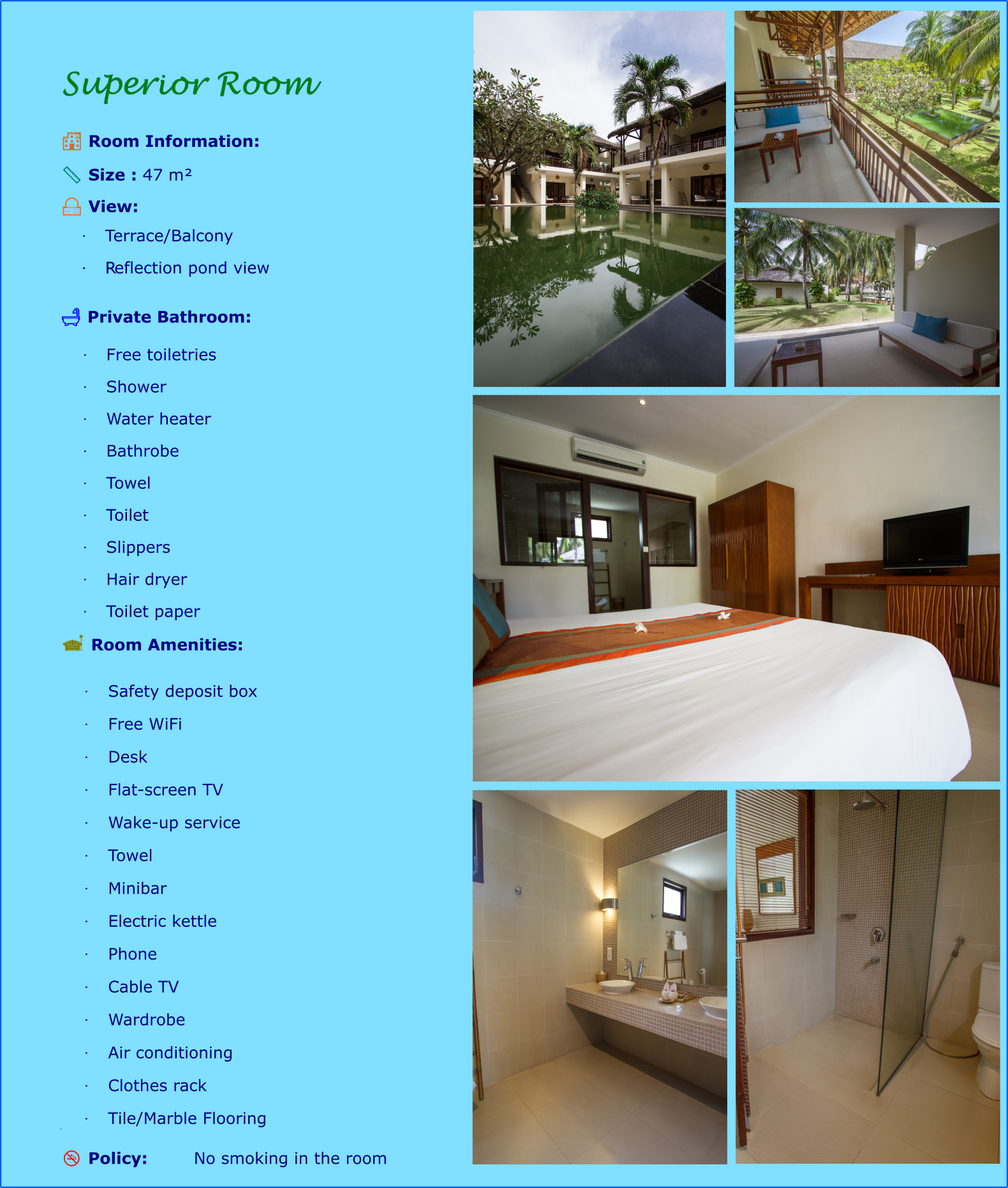 - Within a 2-story structure with thatched roofing, the Superior Resort room are at the front of uor resort and are close to the heart of Mui Ne, but the balconies and patios overlook a relaxing reflection pond to provide you with the best both worlds.